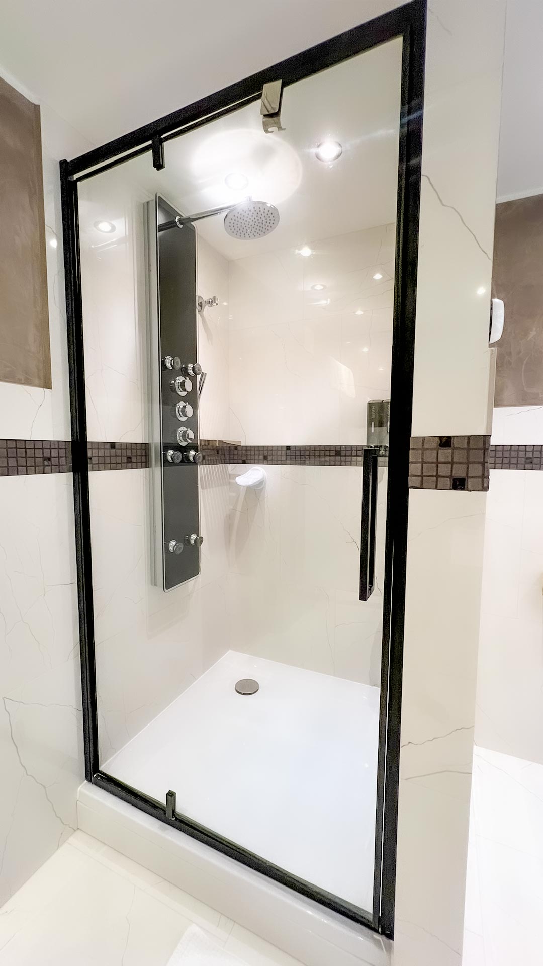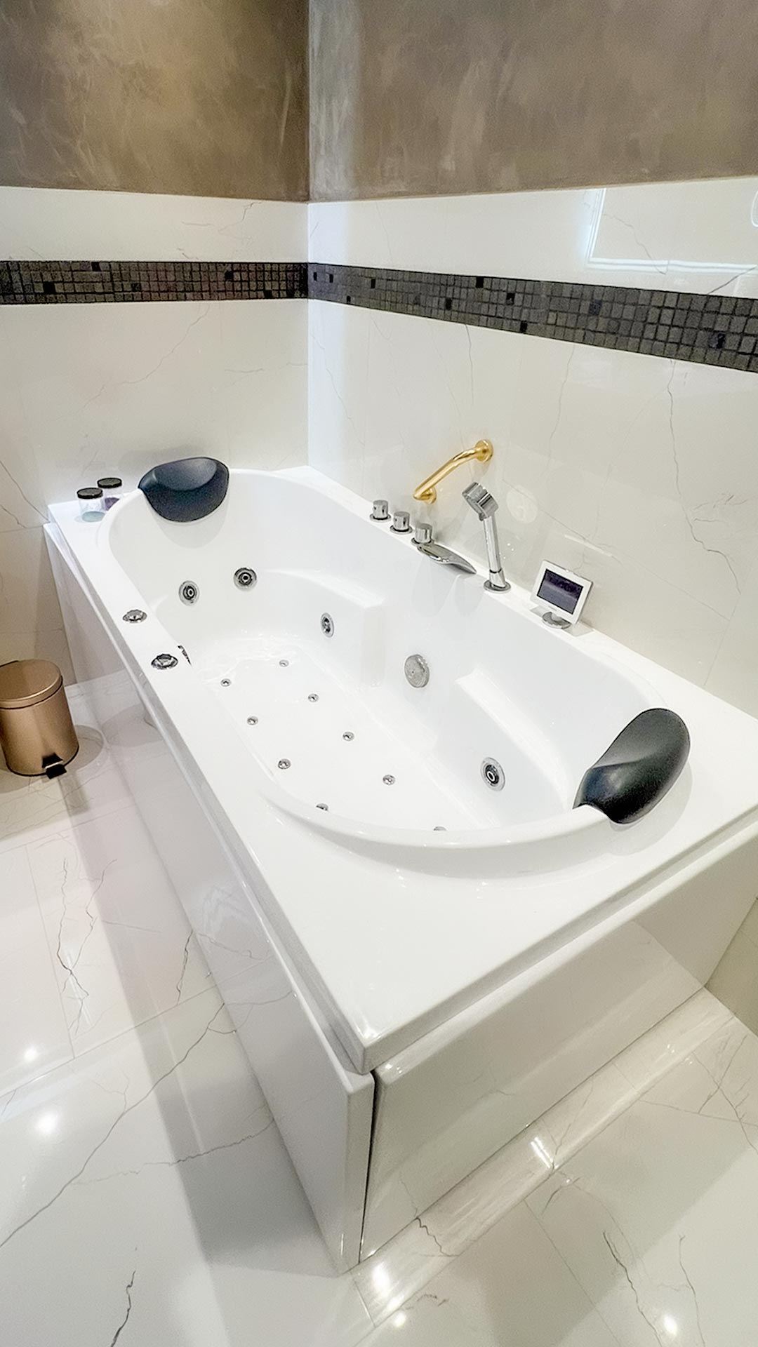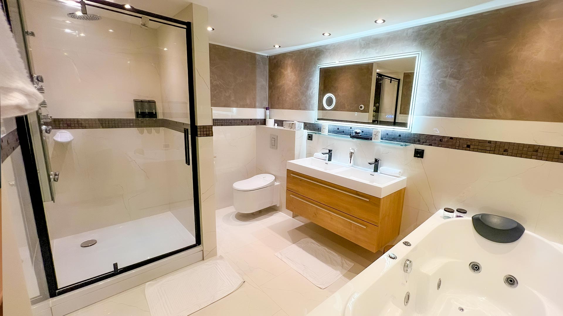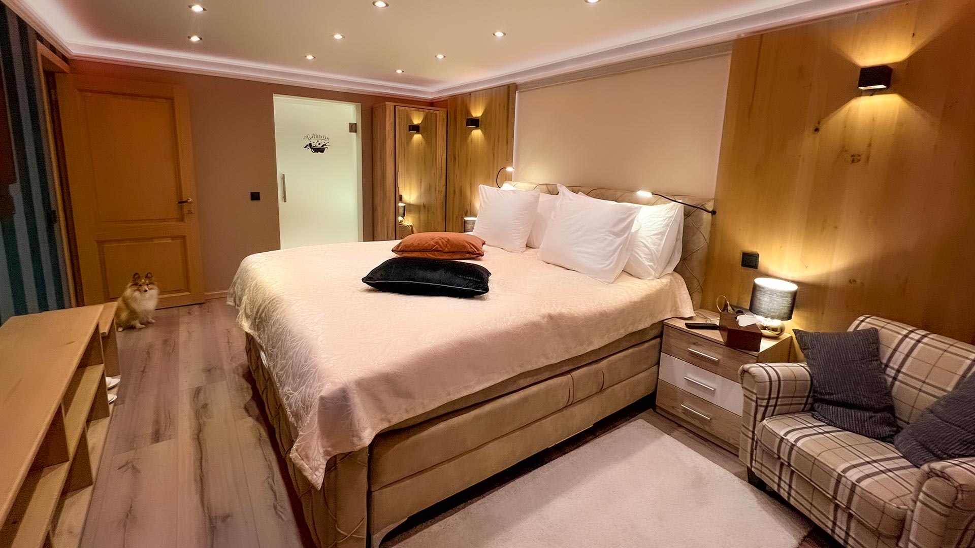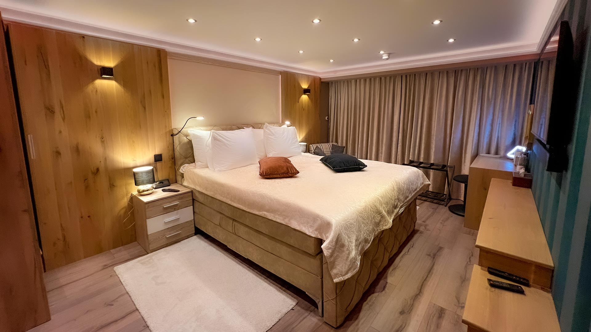 Unser schönes Luxuszimmer ist sehr geräumig und mit allen Annehmlichkeiten ausgestattet, die Sie benötigen. Genießen Sie eine belebende Dusche mit den vielen Wasser-Massagedüsen oder ein entspannendes Schaumbad. Der Zugang zu unserem Wellnessbereich mit Pool und Sauna ist natürlich in Ihrem Zimmer enthalten.